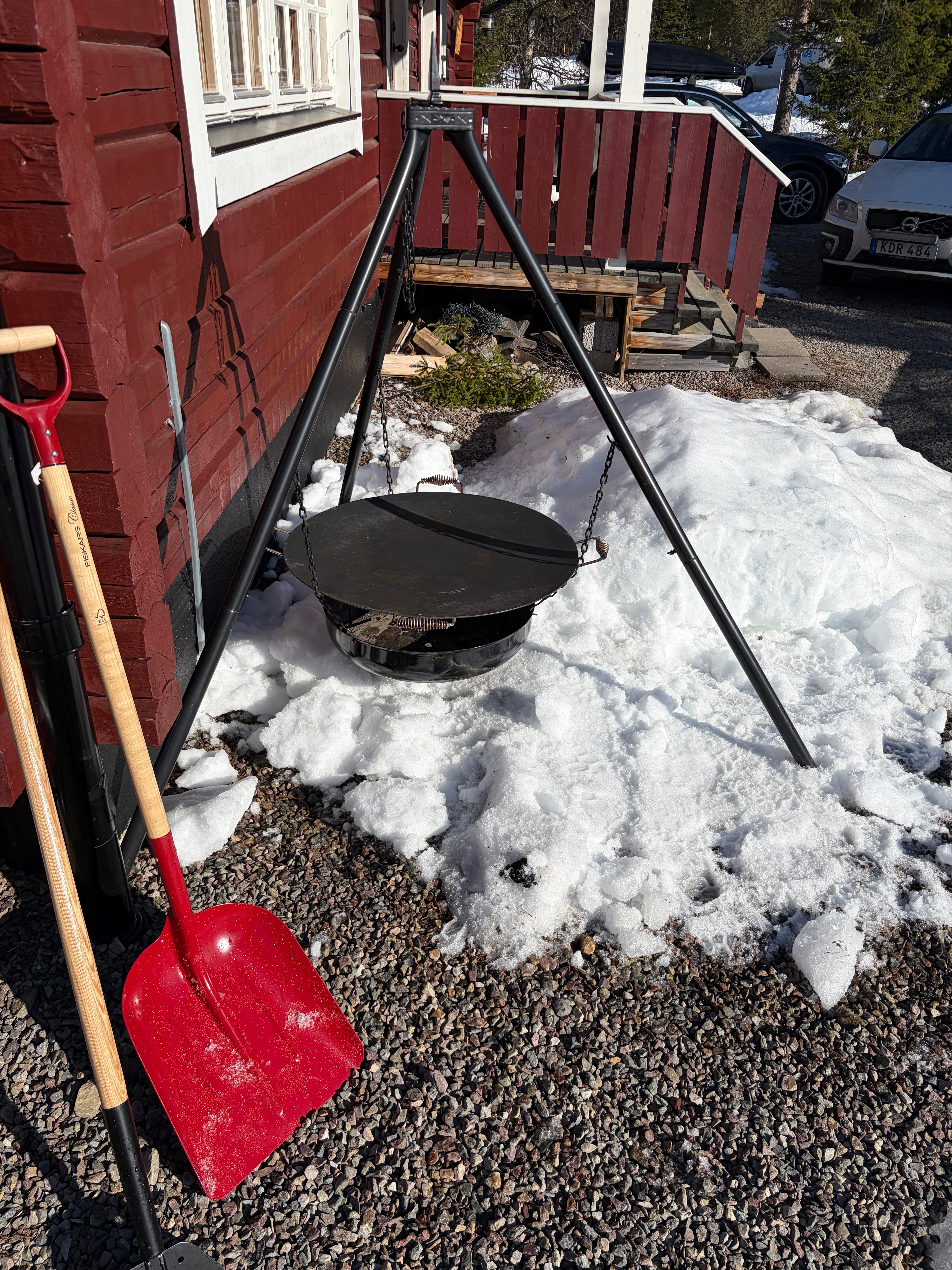 Vi har numera en trefot med eldfat. Dessutom finns ett stekfat. Perfekt för att tillaga renskav utomhus. Renskavet köper